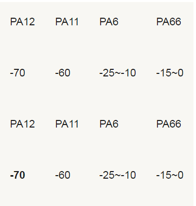 尼龍12的脆性溫度最低,達-70攝氏度,因此,可廣泛用于耐低溫的部件。下表列出尼龍樹脂的脆性溫度: