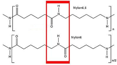 再來看看尼龍,它是Nylon的譯文名稱,它的學術名稱叫聚酰胺纖維,商業名叫錦綸,分尼龍6,尼龍66,尼龍610,尼龍612等好多種。彼此化學主體相似,但是略有差異。以常見的尼龍6和尼龍66為主,詳情見下圖: