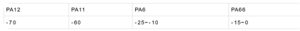 透明尼龍的脆性溫度最低,達-70攝氏度,因此,可廣泛用于耐低溫的部件。下表列出尼龍樹脂的脆性溫度: